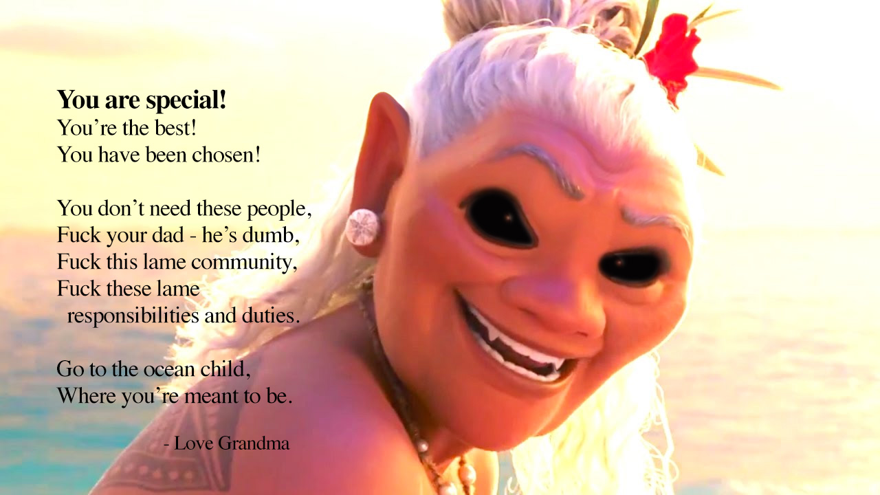 ‘You are an individual. You are great. Moana, you are special, better than the rest, the rules don’t apply to you. You’ll make it. The ocean is your friend!’